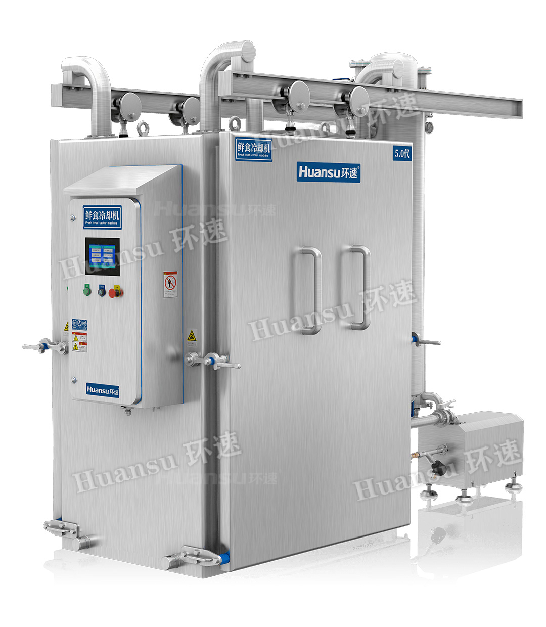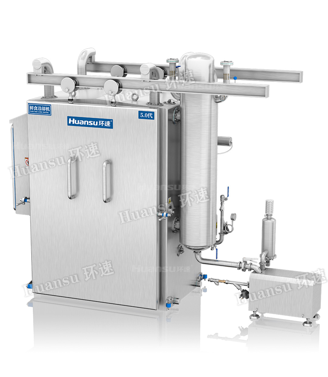 真空冷卻機通過(guò)水環(huán)泵、蒸汽射流和高效率換熱器的三級抽真空形式,實(shí)現了快速、高效率、節能的真空系統,能用較低的能源使真空室內快速的達到真空狀態(tài),使食品內的熱量可以在短時(shí)間內釋放出來(lái),實(shí)現了節能低耗的效果。歐洲IP69K衛生等級隔離艙,增加了設備的衛生等級,避免了食品在真空箱內被二次污染的可能性。