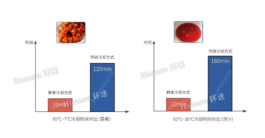 鮮食冷卻機使用控菌冷卻方式,將待冷卻食品從高溫降到常溫(20-25℃)僅需3-10分鐘(因食材而定),降到10℃以下需9-28分鐘。鮮食冷卻機相比傳統冷卻時(shí)間大幅縮短,只需傳統冷卻時(shí)間的1/40,高效率的冷卻方式使得產(chǎn)量成倍增長(cháng)。1-2年收回成本。高效率的冷卻方式使冷卻后的食品品相更佳,同時(shí)防止細菌滋生、保質(zhì)期延長(cháng),更衛生!研發(fā)設計的智能湯汁冷卻系統,可冷卻不同種類(lèi)帶有湯汁的佳肴